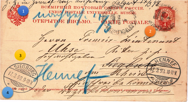4. Ankunftsstempel Siegburg 17.3.1893, 9-10 Uhr vormittags, Ankunftsstempel Hennef 17.3.1893, 10 – 11 Uhr vormittags