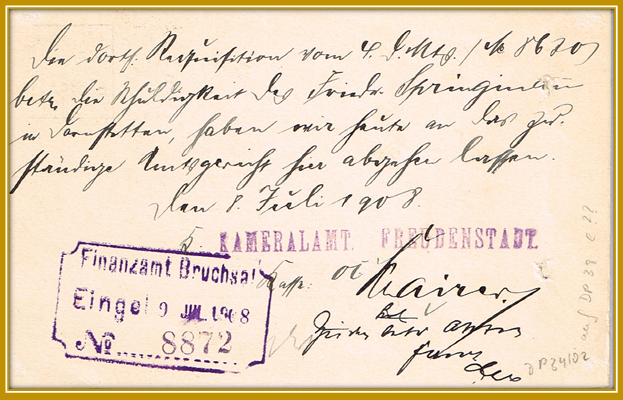 Der Beleg selbst war nur einen Tag unterwegs, abgestempelt am 8. Juli 1908 erhielt der Beleg einen Eingangsstempel vom 9. Juli 1908 und eine Registrierungsnummer vom Finanzamt Bruchsal 8872.