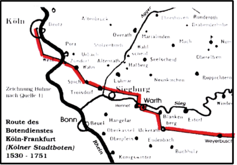 Als Reiterboten besorgten die Kölner Stadtboten den Botendienst Köln - Frankfurt. Handelsherren- und Kontore, aber auch Bürgermeister und Räte beider Städte waren ihre Auftraggeber. Die Reiter starteten jeweils donnerstags und sonntags um 13.00 Uhr auf dem Neumarkt. Der Weg führte von Köln - Weiß (Fähre) – Zündorf -Spich - Troisdorf – Siegburg - Weingartsgasse (Furt) - Hennef - Warth – Blankenberg -Uckerath - weiter nach Frankfurt. Nach langen Machtkämpfen mit dem Hause von Thurn und Taxis wurde diese Linie erst im Jahre 1751 eingestellt.