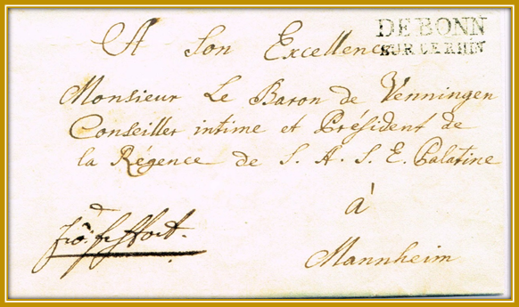 1775: Teilfranko-Brief von Bonn über Uckerath nach Mannheim. Vermerk: “frco Frankfurt” Keine postalischen Vermerke. Stempel: “DE BONN SUR LE RHIN” (1170-1785)