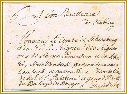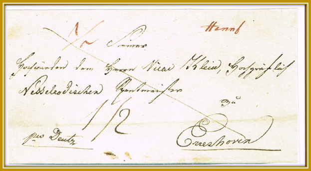 1783: Brief von Hennef nach Düsseldorf, per Boten zur Thurn u. Taxis-Posthalterei Siegburg, handschriftlich “de Sieburg” (durch Postmeister Halm), Postlinie bis Köln, Route Köln-Münster über Dormagen nach Düsseldorf