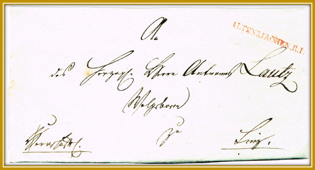 1810: Dienstbrief von Altenkirchen nach Linz/ Rhein. Beförderung: von Weyerbusch bis Uckerath auf der Grhzgl. Berg. Fahrpost, ab Uckerath mit Botendienst nach Linz. Stempel in Rot: “ALTENKIRCHEN R.1” Ab 1801 war die Post nach franz. Vorbild organisiert und in “Rayone” aufgeteilt. Unser Raum gehörte zum “Rayon 1” (R.1),