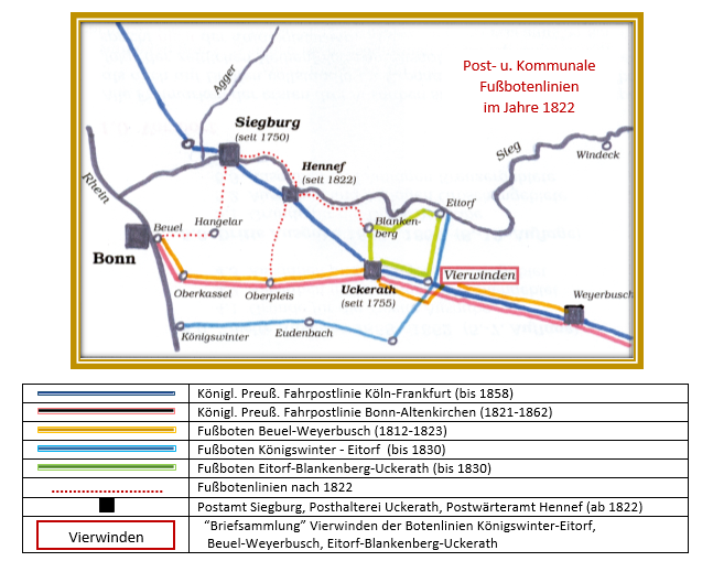 Nach den Befreiungskriegen 1813 kam das Postwesen in unserem Raum praktisch zum Erliegen. Die Landbevölkerung behalf sich, in dem sie sich “Kommunaler Fußboten” bediente. Diese wurden von den Bürgermeistern der Landgemeinden eingesetzt und besoldet. Sie beförderten 2-3 Mal in der Woche Briefe zwischen den Bürgermeisterämtern und den Landräten. Daneben durften sie private Post der Landbevölkerung zu und von den Poststationen Siegburg und Uckerath bestellen.