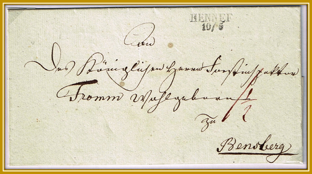 1826: 10. Mai, Brief von Hennef nach Bensberg, Zweizeiliger Langstempel “HENNEF 10/6” Taxe: “ 1 ½ ” (Silbergroschen) in roter Tinte Beförderung: Fahrpost Linie Frankfurt-Köln, Teilstrecke Siegburg-Köln, Fahrpost Köln-Lennep, Teilstrecke Bensberg