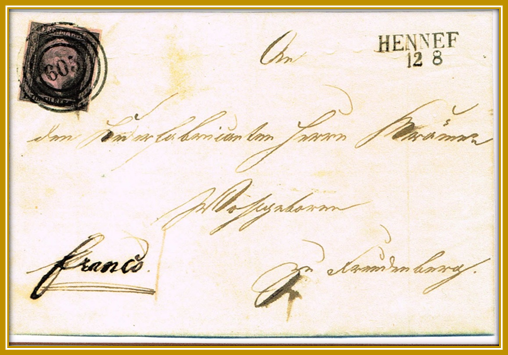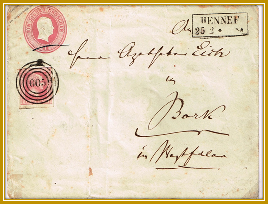 Aufgabe: Hennef, portogerecht 1 Sgr. , Entwertung Vierkreis-Nummernstempel “605”