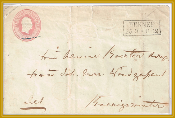 Nach 1853: 3. Dezember, Couvert m. Wertstempel 1 Sgr., portogerecht von Hennef nach Bonn. Entwertung des Wertstempels unvorschriftsmäßig mit Ortsstempel (Rahmenstempel 1. Zeile Ort, 2. Zeile Datum, Uhrzeit) Eingang Bonn am Aufgabetag (3.12.)