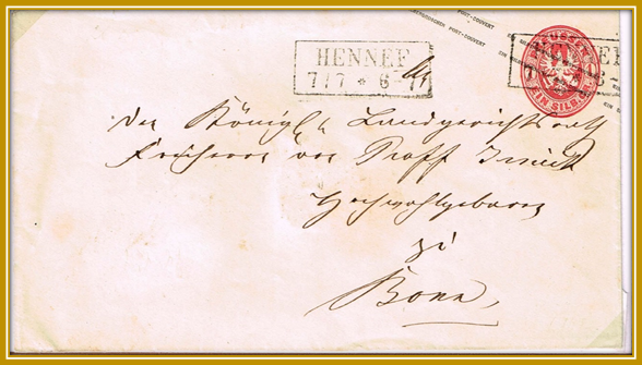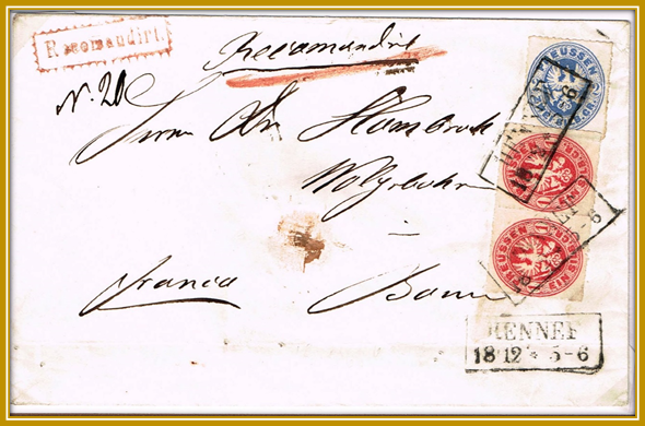 1866: 18. Dezember, Recomandirter (Einschreiben)-Brief von Hennef nach Bonn, portogerecht 4 Sgr. Mischfrankatur, 2 x 1 Sgr rosa, 1 x 2 Sgr., Taxe: Briefporto bis 10 Meilen Entfernung, 1-2 Loth Gewicht = 2 Sgr., Recomandirt-Gebühr (Einschreiben) = 2 Sgr., Gesamt: 4 Sgr. (Postvereinstaxe)