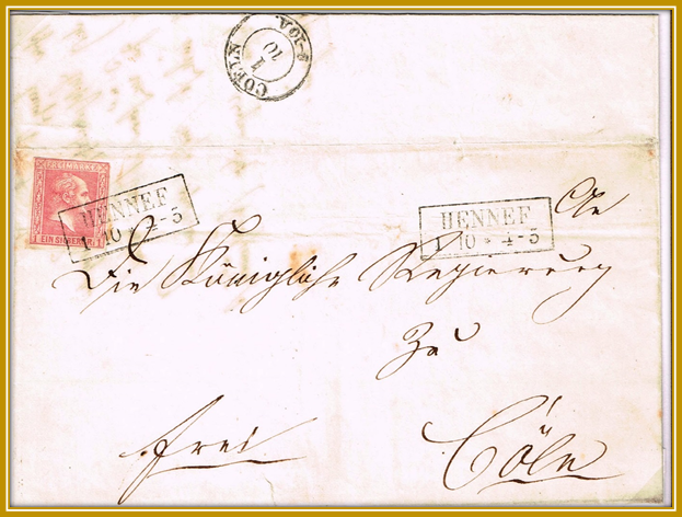 Nach 1858: Brief von Hennef nach Köln, Frankatur 1 Sgr. rosa, portogerecht, Entwertung Rahmenstempel Nr. 4, Eingang Köln am Aufgabetag