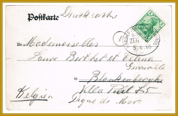 1905, 5. Juni. Postkarte gelaufen als Drucksache von der Bahnpost der Brölthalbahn mit ovalem Bahnpoststempel vom Zug 2 nach Blankenberghe in Belgien.