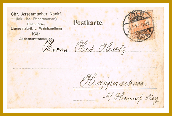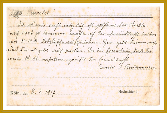 „Da es mir nicht möglich ist, jetzt in der Kürze nach dort zu kommen, möchte ich Sie freundlichst bitten, mir 5 bis 10 Pfund Malzkaffee aufzuheben. Hier gibt’s keinen mehr und den es gibt nur auf Marken. In der Erwartung, dass Sie meine Bitte erfüllen grüßt sie freundlichst Familie J. Rademacher. Köln, den 8.2.1917“