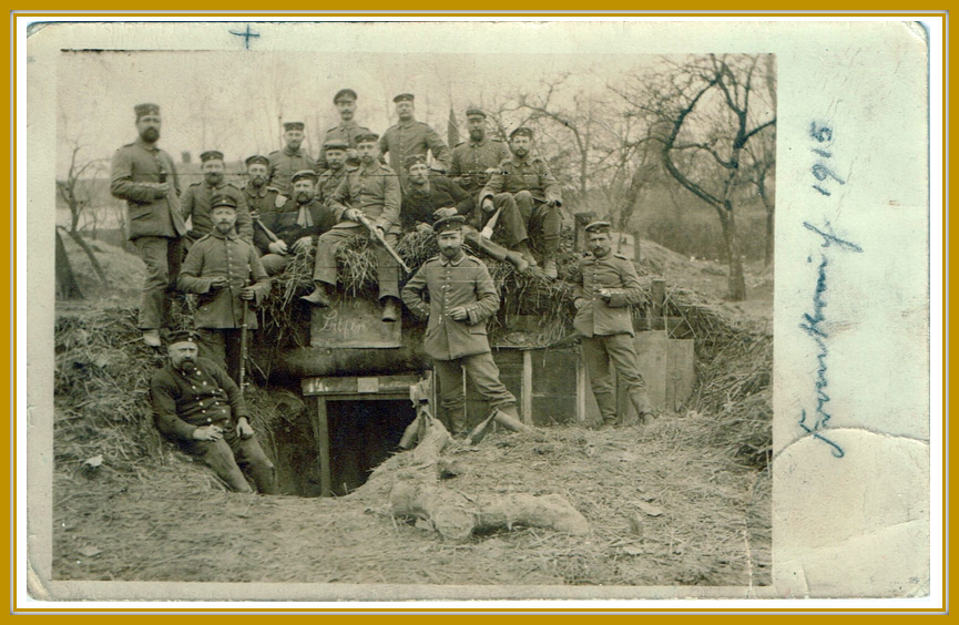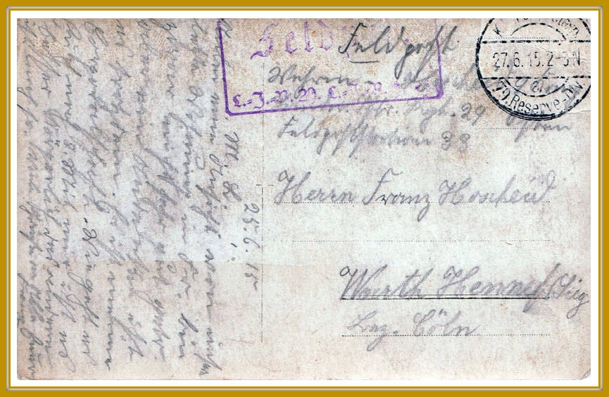1915: 27. Juni, Feldpostkarte an “Herrn Franz Herscheid” wohnhaft in Warth Hennef (Sieg). Der Hauptstempel zeigt die Einheit des Absenders, die 79. Reserve-Division. Zu diesem Zeitpunkt war die Division an der Ostfront in Kämpfe vom 21. Juli bis 7. August in Kämpfe an der Jesia und bei Wejwery verwickelt.