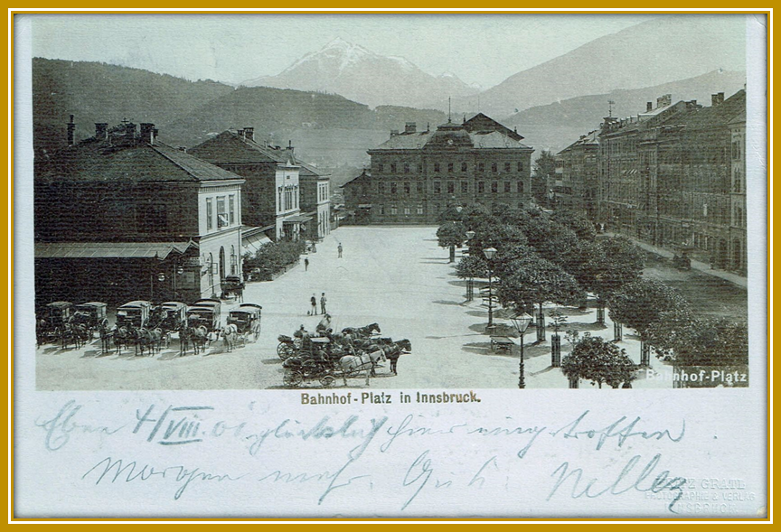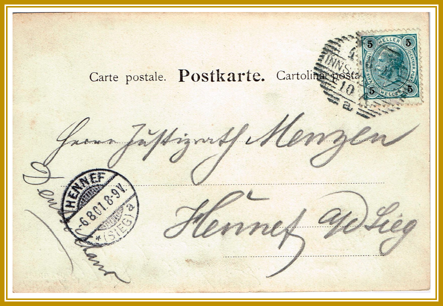 Oben: 1901, 4. August: Ansichtskarte von Innsbruck mit Schraffenstempel vom 4.8.1901 nach „Hennef a/d Sieg“. Ankunftsstempel vom 6. August 1901, 8-9V. Die Laufzeit betrug also nur 2 Tage.