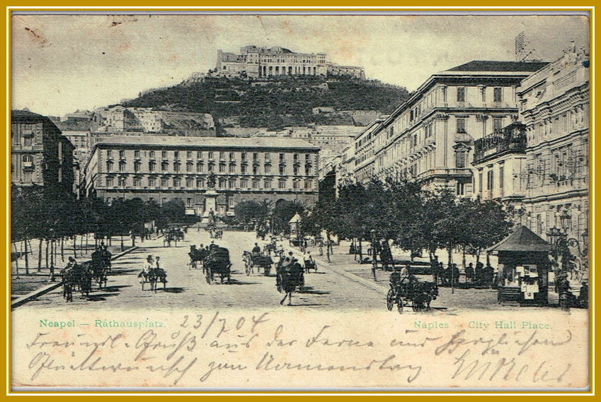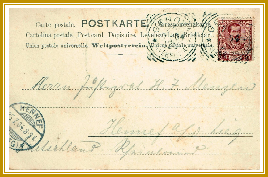 Unten: 1904, 23. Juli: Ansichtskarte mit Motiv von Neapel gelaufen von GENOVA (Genua) nach „Hennef a/d Sieg“. Der Stempel ist ein bizarrer 4-Ring-Stempel in quadratischer Form. Die Karte hat einen Ankunftsstempel vom 25.7.1904. 2 Tage, eine Beachtliche Leistung für die damalige Zeit.