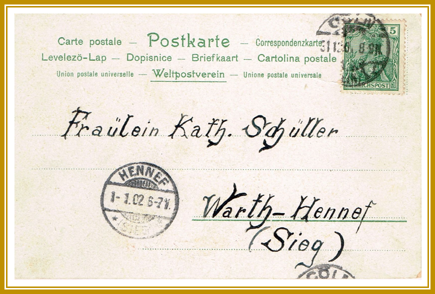 Oben: 1901, 31. Dezember. Und auch an Sylvester / Neujahr funktionierte die Post. Mit 5 Pf Germania frankierte Postkarte an Frau Kath. Schüller von Cöln nach Warth – Hennef (Sieg) und Ankunftsstempel Hennef (Sieg)