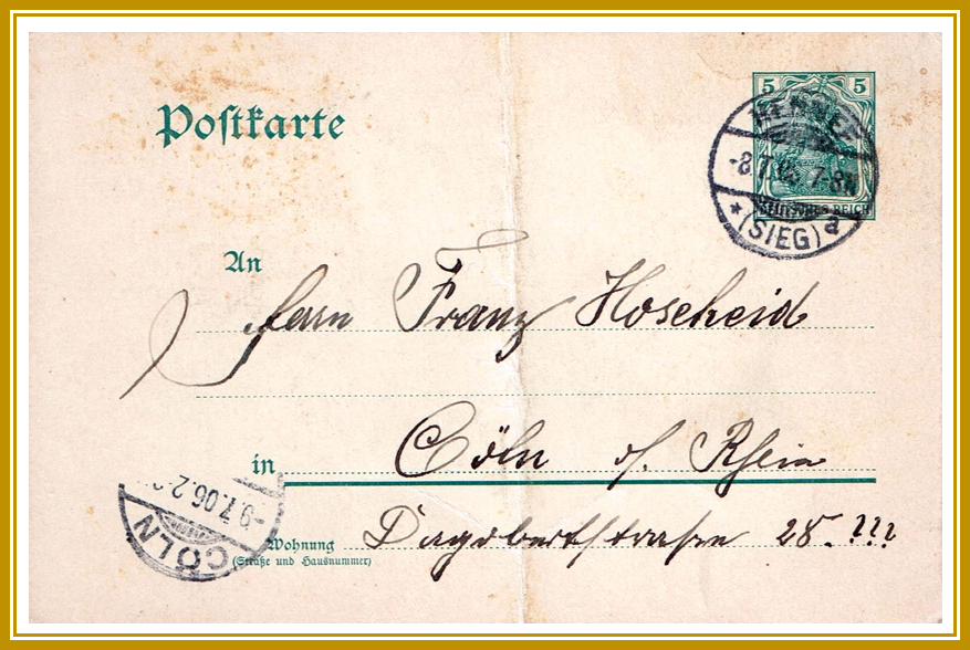 Unten: 1906, 8. Juli. Postkarte von Hennef (Sieg) an Familie Franz Hoseheid in Köln mit Ankunftsstempel „CÖLN“