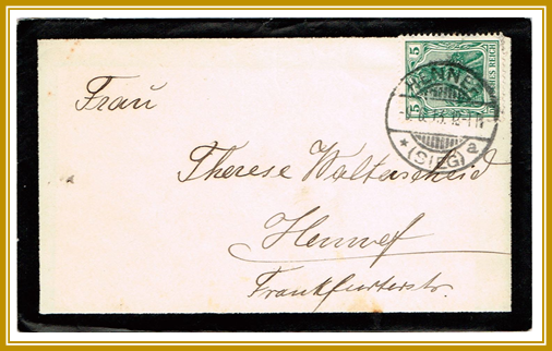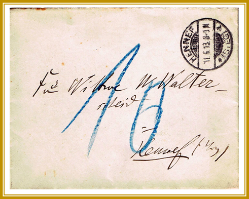 Oben: 1913, 11. Juni. Kleiner Trauerbrief, abgestempelt ohne Briefmarke (Vorläufer eines Freistemplers).