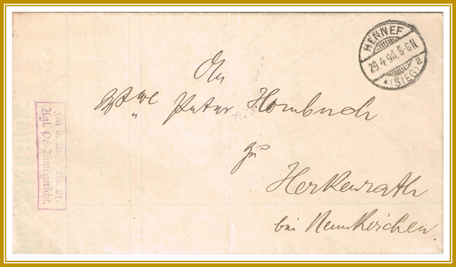 1898, 29, April. Faltbrief gelaufen von Hennef (Sieg) nach Herkenrath bei Neukirchen. Stempel-Charakteristika. Φ = 25,5 mm, Sehne „(SIEG)“ = 1,2 cm.
