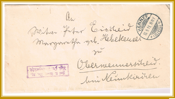 1911, 29, April. Faltbrief gelaufen von Hennef (Sieg) nach Obernennerscheid bei Neukirchen. Stempel-Charakteristika. Φ = 26,5 mm, Sehne „(SIEG)“ = 0,85 cm.