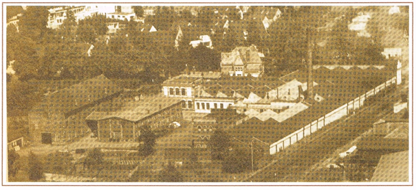 Werksgelände mit Villa und Kutscherhaus unmittelbar neben der Bahnlinie Deutz-Giessen