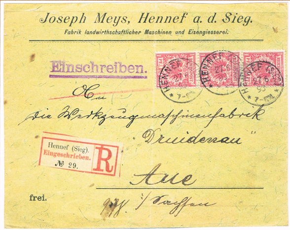 1893: 27. Juni, Einschreiben-Brief von Hennef nach Aue/ Sachsen, portogerecht 0,30 Mark, 3 x 10 Pfg. rosa.