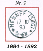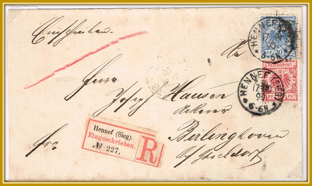 oben: 1890: 17. Oktober, Einschreibebrief von Hennef nach Birlinghoven (Post Stieldorf) Einkreis-Ortsstempel: “*HENNEF* 17/10 90 5-6N”