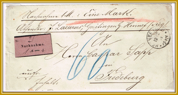 unten: 1894: 12. Februar, Nachnahme-Brief "unfrei" von Hennef nach Fredeburg über 1 Mark, Nachnahmeaufkleber lila: “Nr. 2 Nachnahme. 1 M Pfg.”