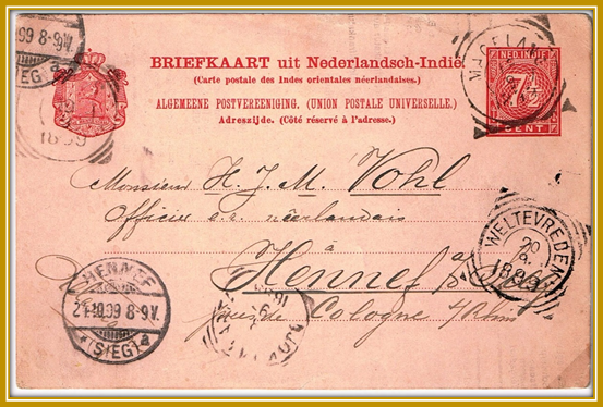 1899: 19. September, Postkarte von MACELANG NIEDERLÄNDISCH-INDIEN nach Hennef