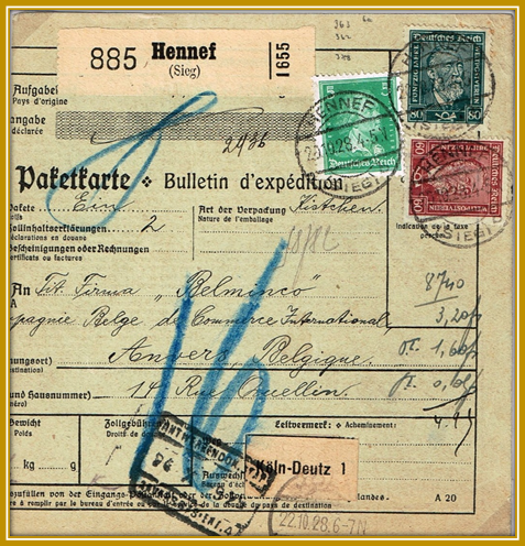 1928: 20. Oktober: Auslands-Paketkarte von Hennef nach Anvers (Belgien) 1 Kistchen, Gewicht 1,5 kg, portogerechte Frankatur 1,45 RM