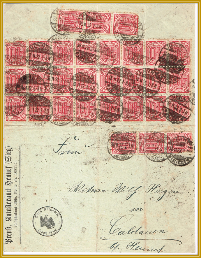 1922: 30. November, portopflichtiger Dienstbrief von Hennef nach Kaldauerı (Umschlag aufgetrennt), portogerecht 12,00 Mark (Massenfrankatur 30 x 40 Pfg, in Dienstmarken)