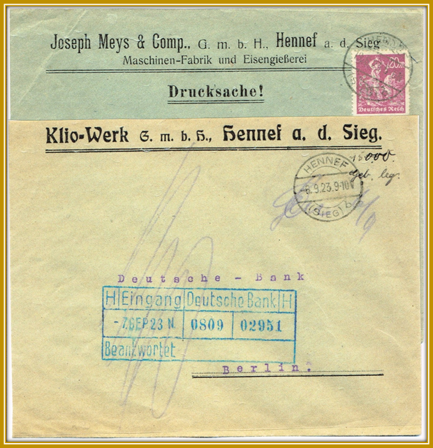 1923: 6. September, Drucksache von Hennef nach Berlin, portogerecht 15.000 Mark (Portoperiode 1.9.- 20. 9. 1 923)