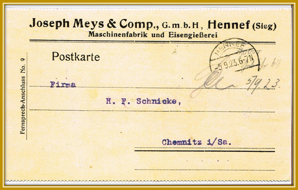 1923: 5. September, Postkarte von Hennef nach Chemnitz, portogerechte Barfrankatur 30.000 Mark (handschriftlich), Portostufe 1.9. - 19.9.1923
