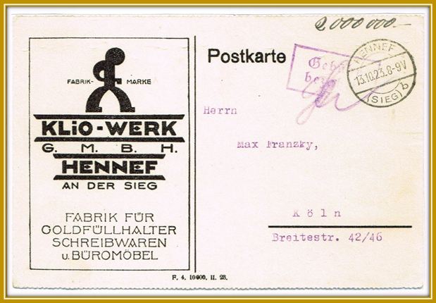 1923: 13. Oktober, Postkarte von Hennef nach Köln, Barfrankatur, 2.000.000 Mark handschriftlich, Stempel: „Gebühr bezahlt“