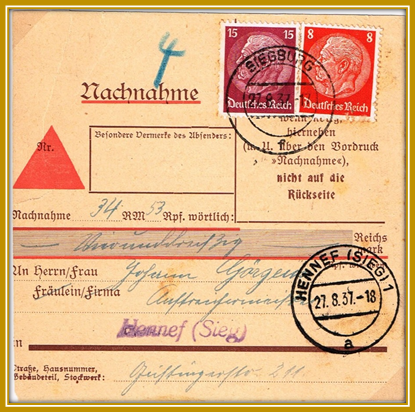 1937: 27. August, Nachnahmekarte von Siegburg nach Hennef über 34,53 RM, portogerecht 23 Rpfg., Eingangsstempel: