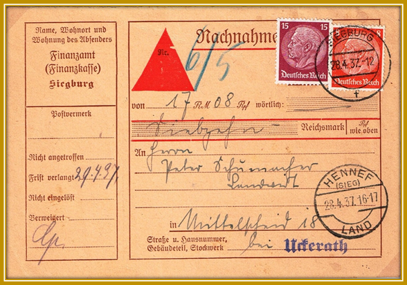 1937: 28. April, Nachnahmekarte von Siegburg nach Mittelscheid (Landzustellbezirk Blankerıberg) über 1 7,08 RM, portogerecht 23 Rpfg Eingangsstempel: “HENNEF (SIEG) 28.4.37 16-17 LAND"