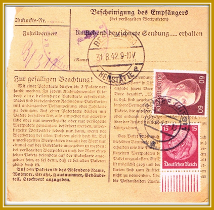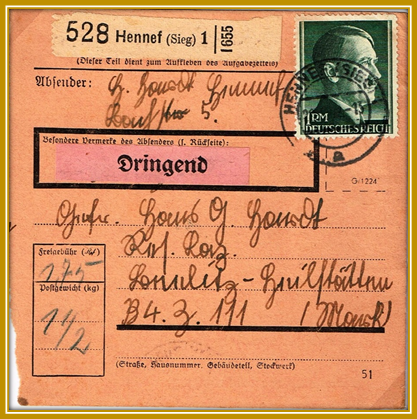 Paketkarten-Mittelteil für ein Schnellpaket von Hennef nach Beelitz (Mark) an den Gefreiten