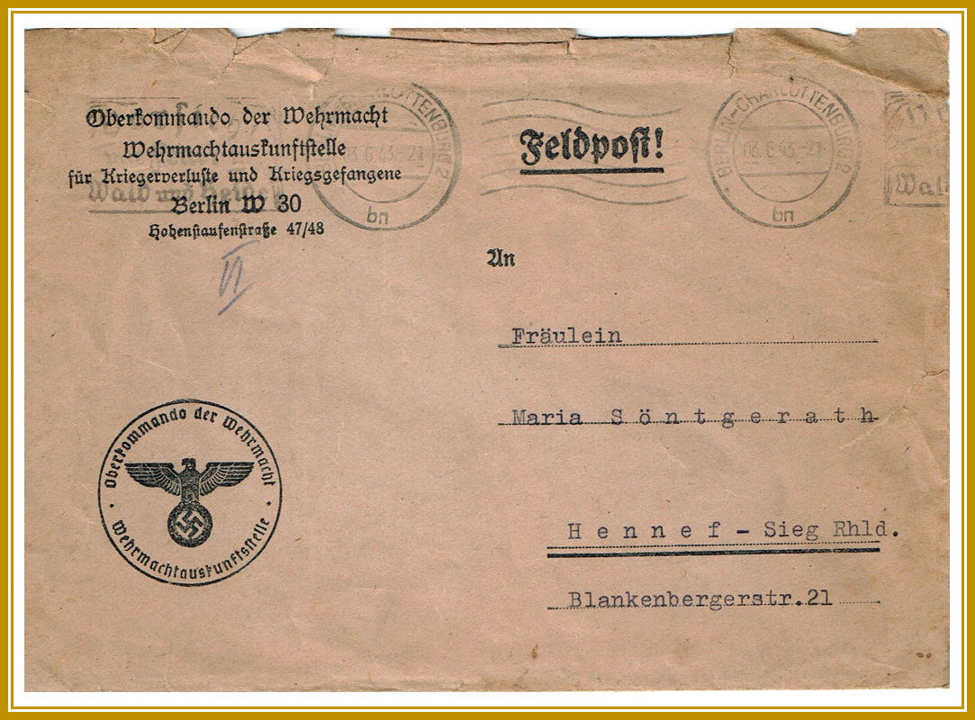Oben: 1943, 3. Juni: Feldpostbrief vom „Oberkommando der Wehrmacht – Wehrmachtsauskunftsstelle für Kriegerverluste und Kriegsgefangene“ gelaufen von Berlin nach „Hennef – Sieg Rhld.“ Der Brief trägt als Ausgangsstempel einen Brückenstempel von Berlin – Charlottenburg.
