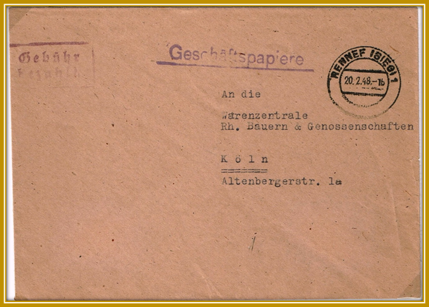 1948: 20. Februar, “Geschäftspapiere” von Hennef nach Köln, Gebühr in bar entrichtet “Gebühr bezahlt". Auch Anfang 1948 herrschte noch Mangel an Briefmarken