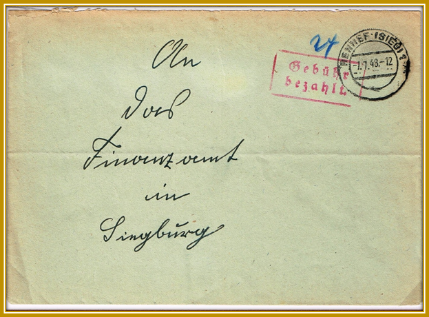 Der Postkunde entrichtete das Porto (24 D-Pfennig) in bar. Der Brief ging von Felderhoferbrück zum Postamt Hennef 1 und wurde hier mit dem Ortsstempel und dem Zusatzstempel “Gebühr bezahlt” versehen und weitergeleitet.