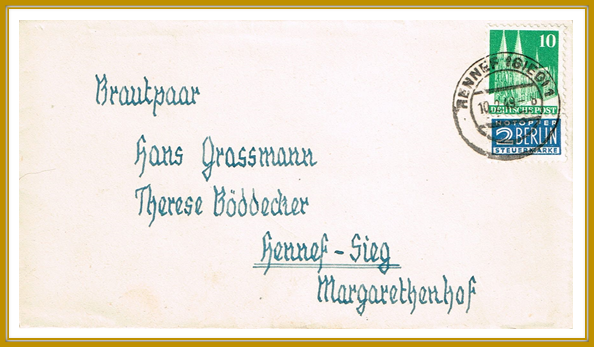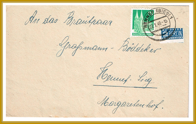 1949, 21. Januar. Ortsbrief von Hennef nach Hennef mit Mi. Nr. 80 „10 Pfennig grün Kölner Dom“, Rundstempel und zusätzlicher Notopfermarke.