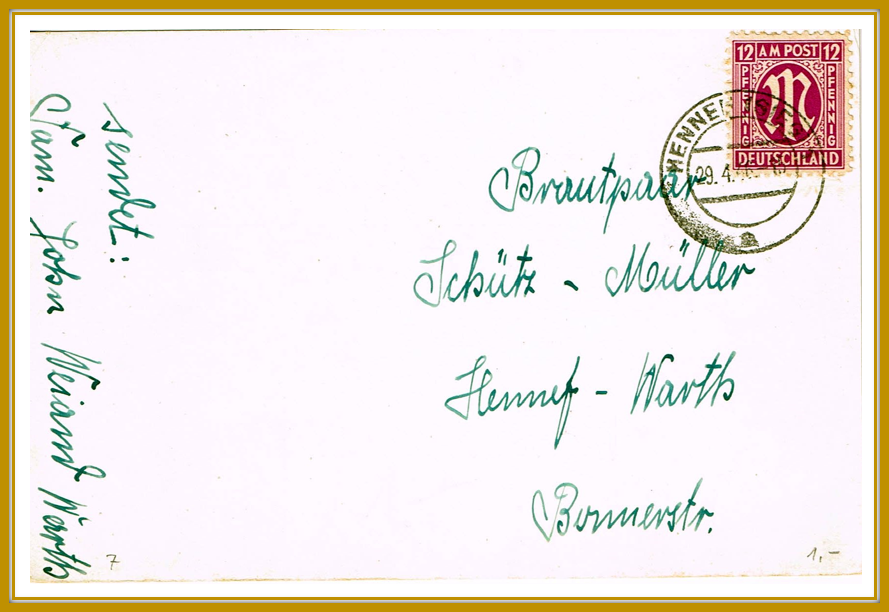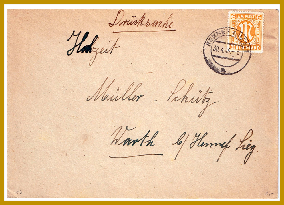 1946: 29. April, Hochzeitskarte von Hennef (Sieg 1) nach Warth bei Hennef, frankiert mit Mi. Nr. 23 (deu. Druck), Alliierte Besetzung AM und Brit. Zone. Die Karte ist portogerecht frankiert mit 12 Pf.