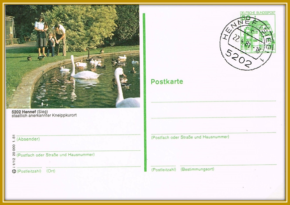 1981: 22. April, Bildpostkarte aus der Serie P 130 , Motiv: “Kurpark Hennef Schwanenteich”, Stempel: “HENNEF (SIEG) 1 22.4.81-18 c 5202” Nr. 18 (1963-1990) |