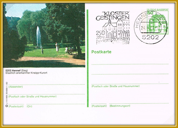 1982: 24. Juni, Bildpostkarte aus der Serie P 130, Motiv: “Kurpark Hennef Text: “Staatlich anerkannter Kneipp-Kurort” Stempel: “Maschinenstempel Werbeklischee “Kloster Geistingen” “HENNEF (SIEG) 1 24.6.82-13 ma 5202” |