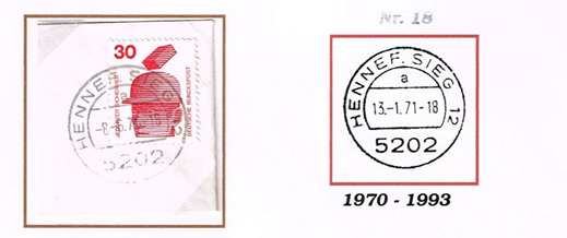 Während alle Stempel der Landgemeinden geändert wurden, blieben die des Postamtes Hennef erhalten. Lediglich die Poststelle II Geistingen erhält eine neue Organisationsnummer "12" und damit auch neue Stempel. (Siehe auch Kapitel 6.8.3 - Poststellen Hennef-Land)