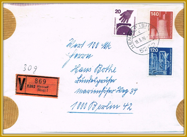 1976: 18. März, Wertbrief von Hennef nach Berlin, Wert: 100 D-Mark, portogerecht Frankatur