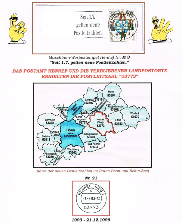 Das konnte aber nur eine Übergangslösung sein. Nach dreijähriger Vorbereitung und großer werblicher Unterstützung kamen die neuen fünfstelligen Postleitzahlen am 1. Juli 1993 zum Einsatz.