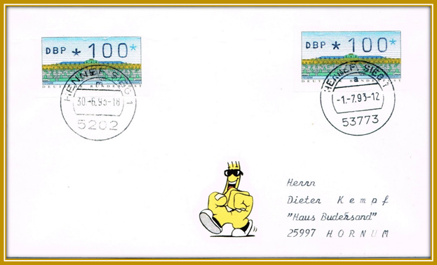 oben: Ein Brief - zwei Stempel: “HENNEE SIEG 30.6.93-18 5202” und “HENNEE SIEG -1.7.19- 12 53773" Philatelistischer Brief von Hennef nach Hornum |