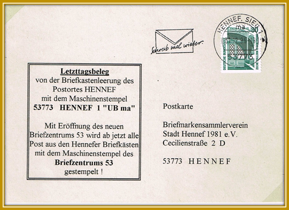 1996: 31. Dezember, Letzttagsbrief mit einem Maschinenstempel der Postfiliale Hennef 1 vor Inbetriebnahme des BRIEFZENTRUMS 53 Maschinenstempel: „HENNEE SIEG „ 31.12.99 -19” mit Werbeklischee “Schreib mal wieder". (M5)