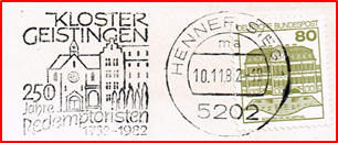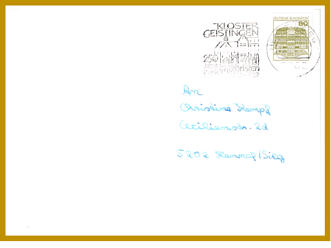 1982, 22. Dezember. Brief gelaufen von Hennef (Sieg) 1 nach Hennef mit Sonderstempel von 1982 „Kloster Geistingen – 250 Jahre Redemptoristen 1732 – 1982“