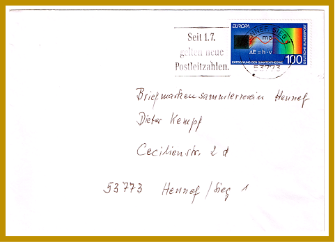1994, 24. Dezember. Brief gelaufen von 53773 Hennef / Sieg 1 nach 53773 Hennef / Sieg 1 mit Sonderstempel „Seit 1.7 gelten neue Postleitzahlen“