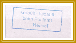 Type 1.4: Dreizeilig, Masse H=1,9 cm, B = 4,6 cm „Gebühr bezahlt beim Postamt Hennef (Sieg)“, Farbe: Blau |